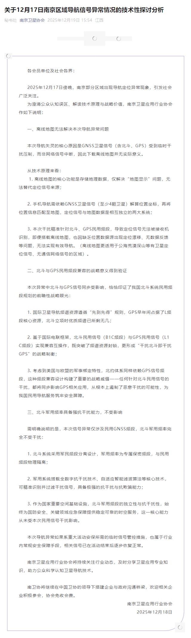 对此,“南京卫星协会”微信公众号今天发布《关于12月17日南京区域导航信号异常情况的技术性探讨分析》。